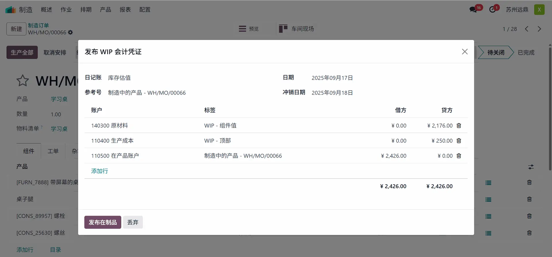 凭证中的最后一个账户是在产品账户 (Work in Progress account)。它计算生产和组件成本的总和,以显示项目的总成本。当资产价值增加时,记为借记(debit)。因此,在产品账户的总价值被借记( deducted 这里指增加资产,所以是借记 WIP 账户)。要將凭证过账到会计中,请点击“过账 WIP”(Post WIP) 按钮。