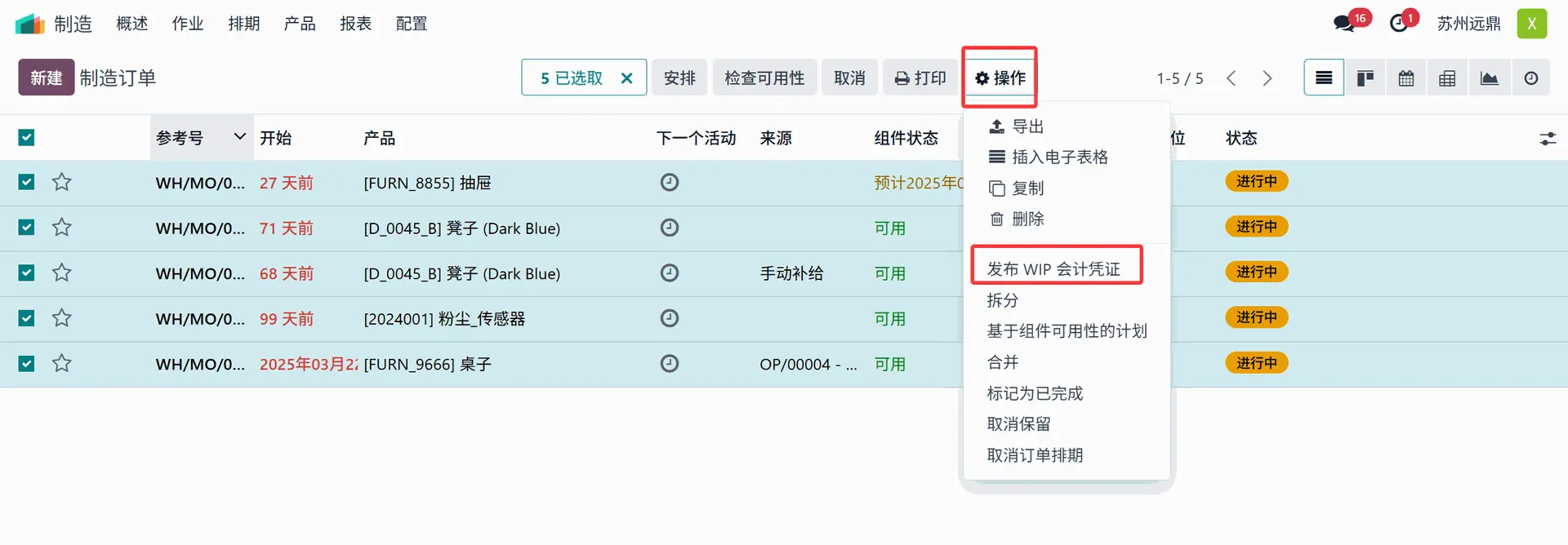 只需一次点击,即可为多个生产订单过账 WIP 会计记录。为此,请打开生产订单并选择所需的订单。订单状态应为“进行中”(In progress)。然后,如前所述,点击“操作”(Action) 按钮并选择“过账 WIP 会计凭证”(Post WIP Accounting Entry) 选项。