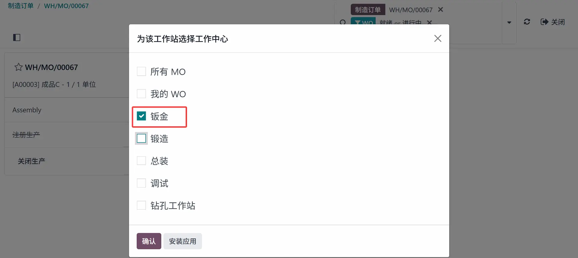 在弹出窗口中将显示工作中心列表。选择所需的工作中心。