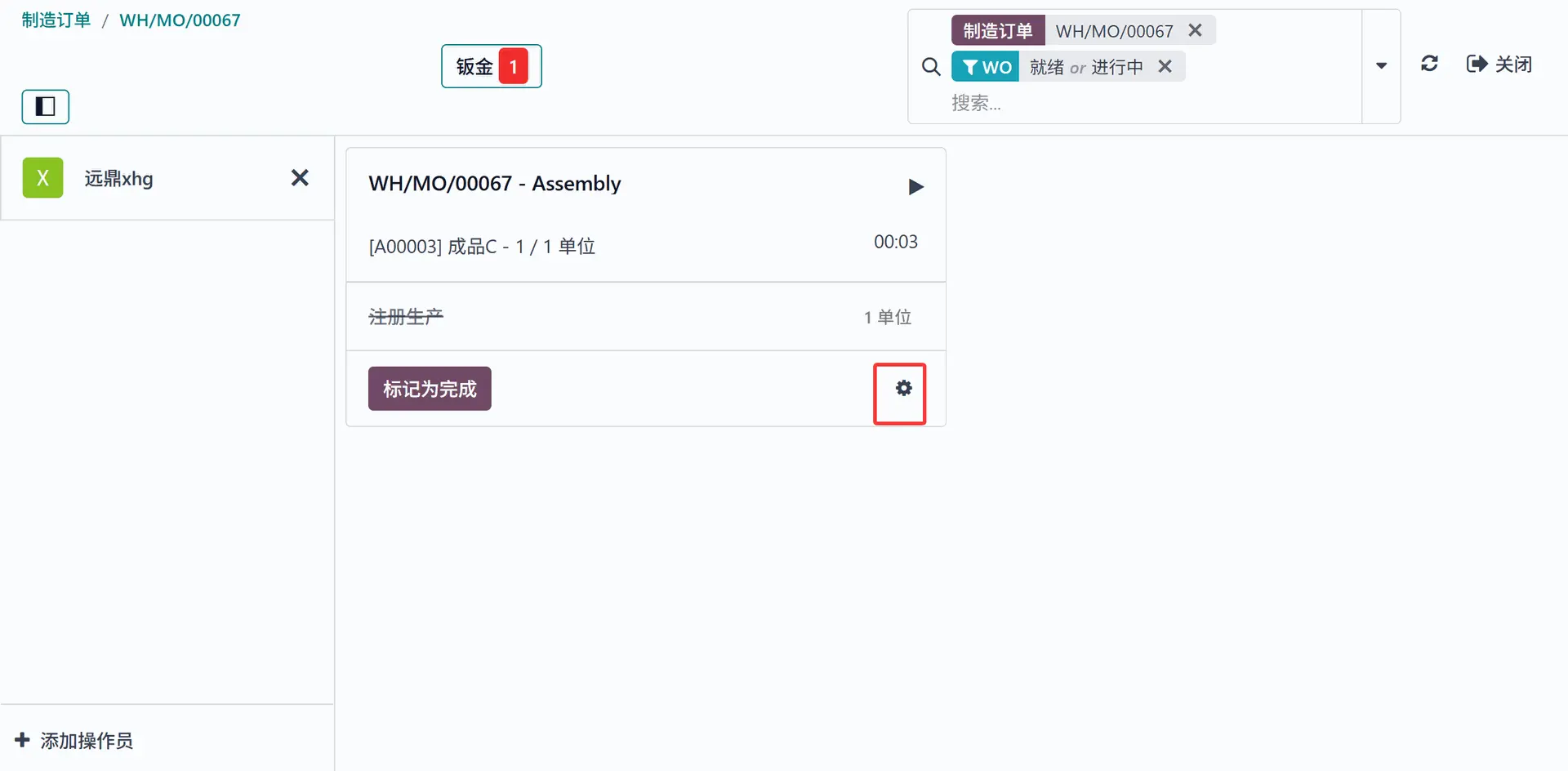 点击“确定”,进入车间,显示该制造订单。在该制作订单中点击齿轮图标。