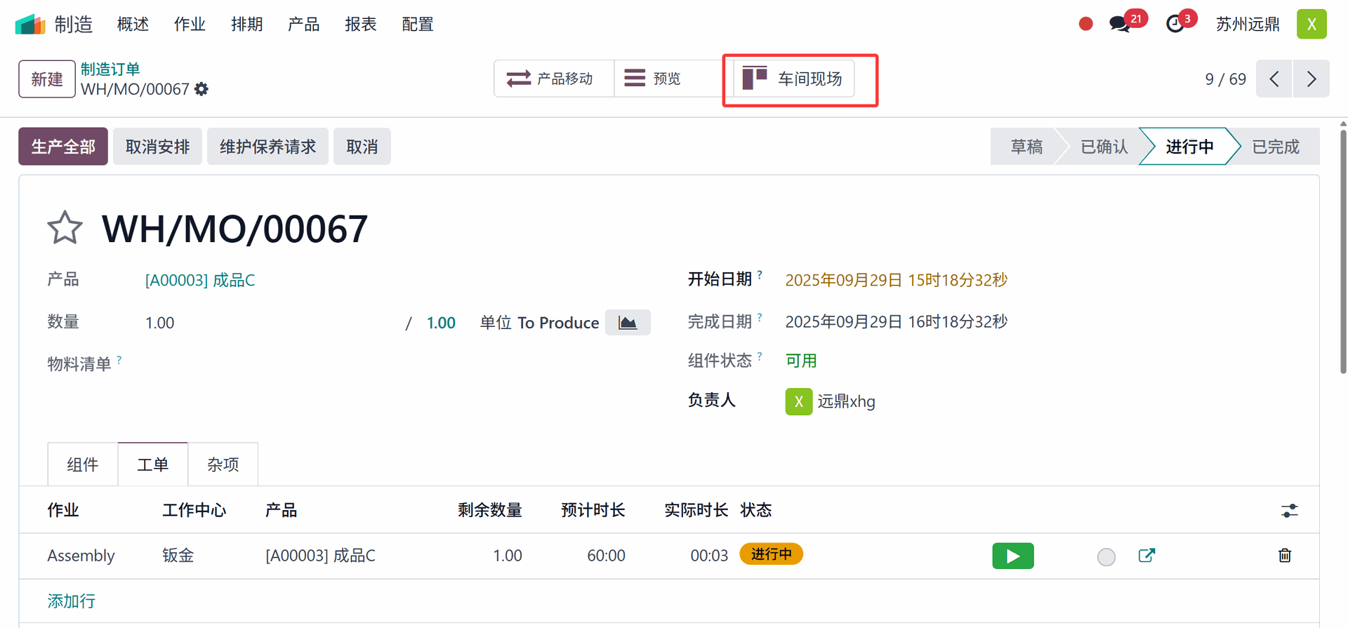 下面的截图显示了一个处于"已确认"阶段的制造订单。有一个名为"车间"的智能选项卡,点击它。将引导您至另一个名为"车间"的模块。