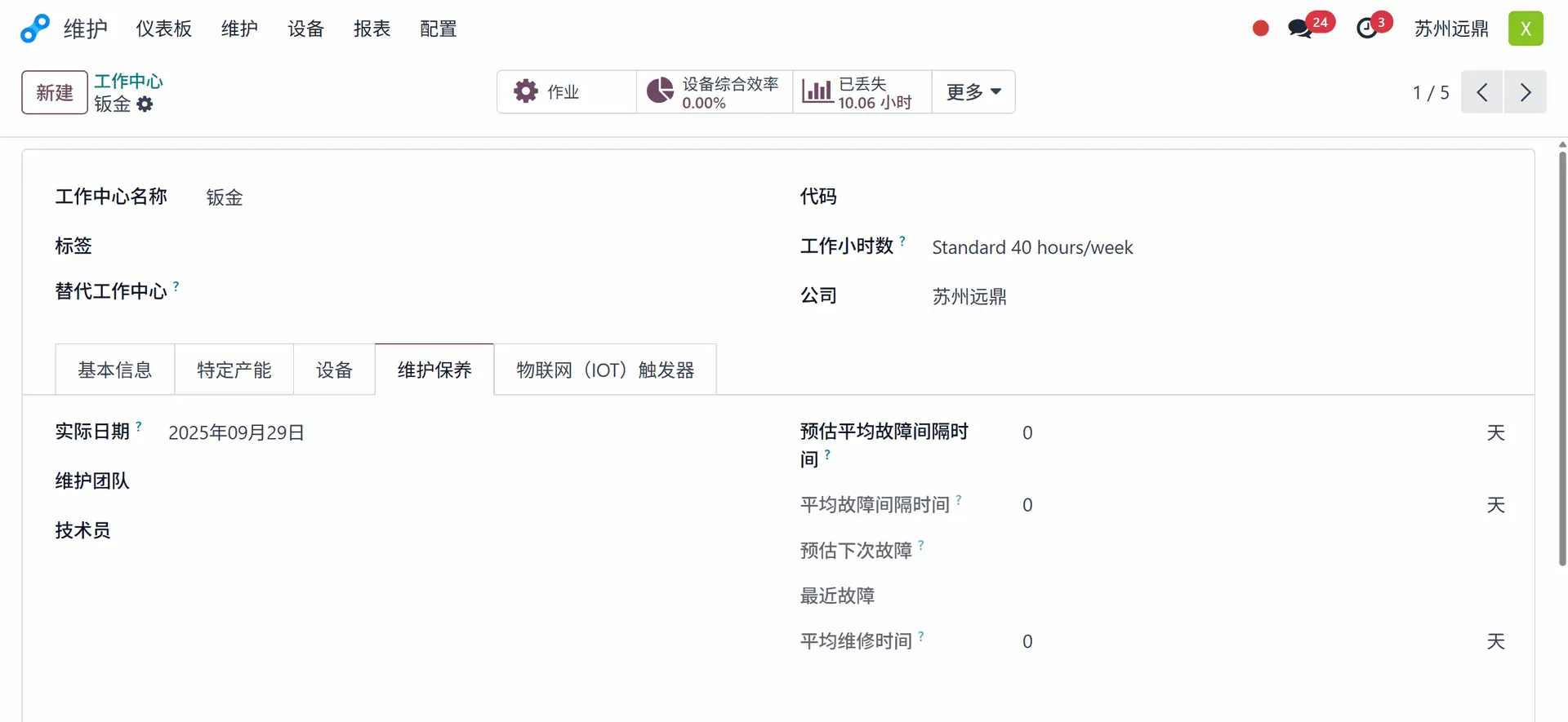 这样,针对生产的维护请求就完成了。用户可以完成生产操作。之后,打开工作中心检查维护详情。在工作中心,有一个名为"维护保养"的选项卡。在维护选项卡内,显示了有关工作中心维护的所有详细信息。