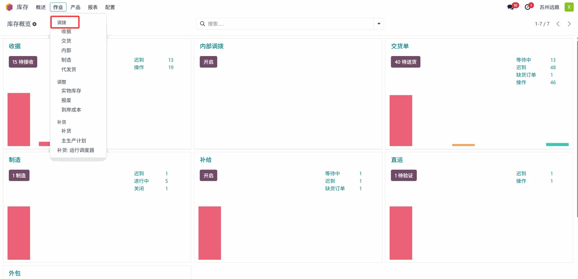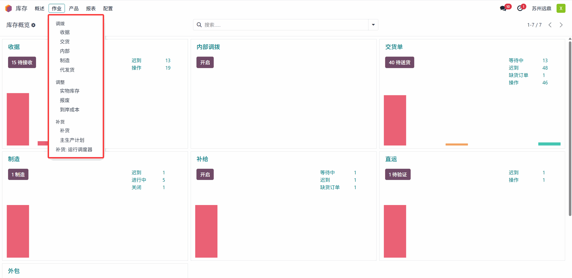 用户可以使用“概览”菜单的“库存概览”面板管理收货、内部调拨、交货单、生产、补给、POS订单、维修、直运和外包等。每个作业类型组中未完成任务的数量会显示出来。