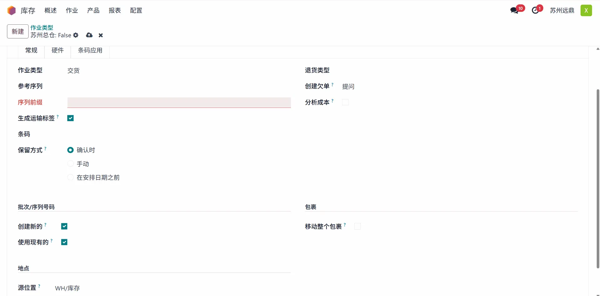 首先,在“作业类型”字段中更改操作的名称。在此配置表单中,Odoo 新增了一个“硬件”选项卡部分。因此,可见“常规”、“硬件”和“条码应用”选项卡。